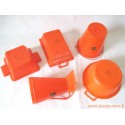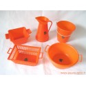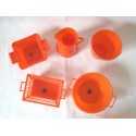 Ensemble de petits ustensiles en plastique orange style jouets de bazar "comme maman" avec seau, broc, cuvettes, panier.