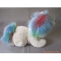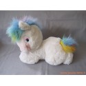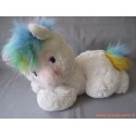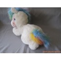 Grande peluche mesurant environ 40 cm représentant un amusant animal style poney blanc avec crinière et queue multicolore arc-en ciel. Date des années 90 époque "Popples" ou Bisounours.