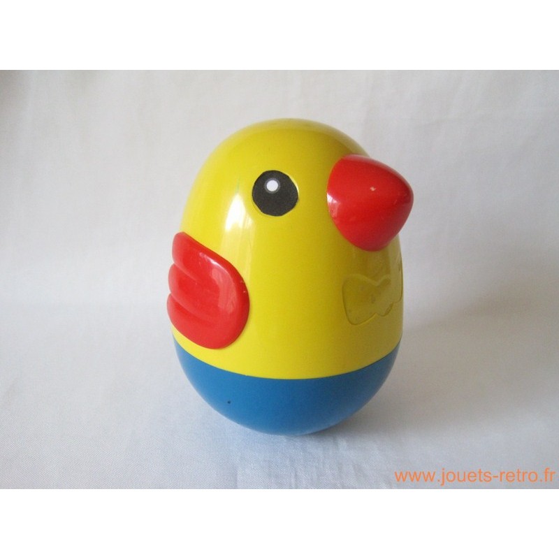 L'oiseau jaune, un culbuto tout rond en plastique brillant aux couleurs vives d'environ 14 cm de hauteur.